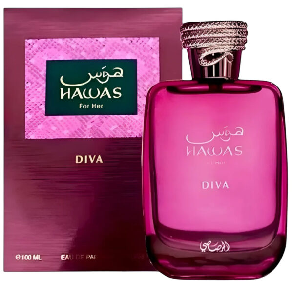 Hawas Diva de Rasasi es una fragancia de la familia olfativa Oriental Floral para Mujeres. Esta fragrancia es nueva. Hawas Diva se lanzó en 2025. Las Notas de Salida son Frutas rojas, ruibarbo y lichi; las Notas de Corazón son Incienso, cedro y rosa; las Notas de Fondo son vainilla, ámbar gris y almizcle.